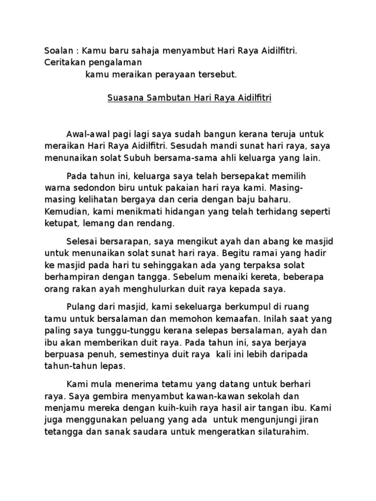 Sambutan hari raya aidilfitri bermula dengan ibadat puasa di bulan ramadan. Pengalaman beraya di kampung pada minggu lepas kami sekeluarga telah pulang ke kampung untuk menyambut hari raya aidilfitri di sanakampung saya . Pengalaman beraya di kampung pada minggu lepas, kami sekeluarga telah pulang ke kampung untuk menyambut hari raya aidilfitri di sana. Hari raya aidilfitri adalah sebuah perayaan yang amat meriah untuk keluarga saya. Pengalaman berhari raya di kampung nenekkarangan bahasa arab hari raya idul. Pada minggu lepas, kami sekeluarga telah pulang ke kampung untuk menyambut hari raya aidilfitri di sana.